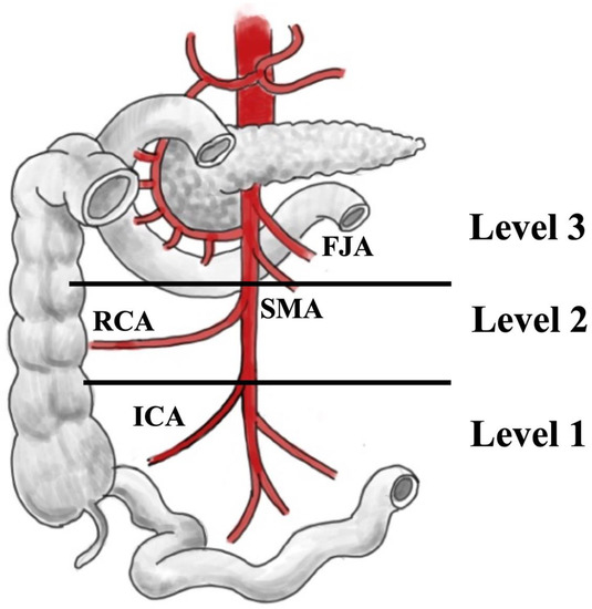 Levels of locoregional lymph node involvement in SI-NENs (modified based on Ohrvall et al. [7]). SMA—superior mesenteric artery; ICA—ileocolic artery; RCA—right colic artery; FJA—first jejunal arteries; D—duodenum.