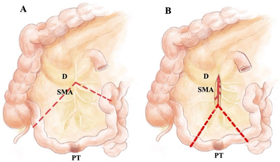 Schematic graph of conventional (A) and vessel-sparing lymphadenectomy (B) in SI- NENs. Red dashed line—dissection line; encircled area in B—superior mesenteric artery as well as right colic artery and vein were dissected free from soft tissue but not transected. D—duodenum; SMA—superior mesenteric artery; PT—primary tumor.