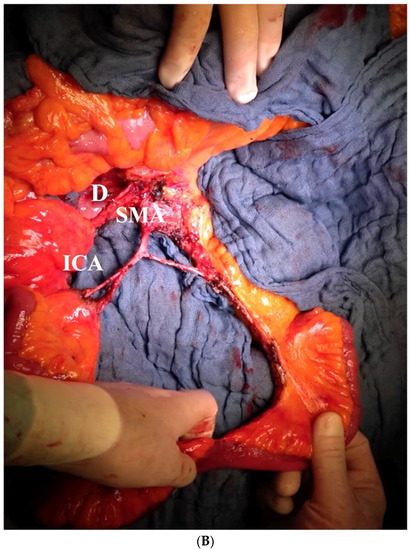 (A) Small bowel specimen after Con-LA: arrow—lymph node metastases level 2. (B) Situs after VS-LA. D—duodenum; ICA—ileocolic artery; SMA—superior mesenteric artery.