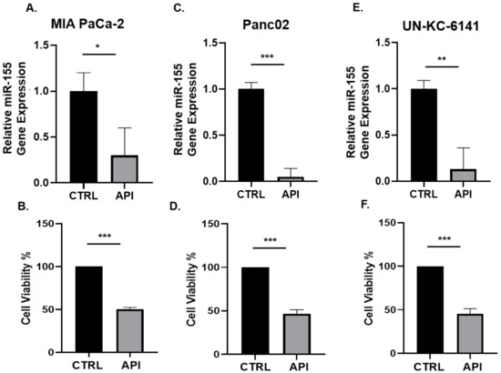 MiR-155 is known to be overexpressed in different cancers, including PC [21,23]. We first assessed whether apigenin could modulate the expression of miR-155 in PC cells. Murine PC cell lines Panc02 and UN-KC-6141 as well as the human PC cell line MiaPaCa-2 were treated with API (40 µM) or DMSO vehicle for 24 h and the expression of miR-155 was examined using RT-qPCR assay. We found that API significantly suppressed miR-155 gene expression in three PC cell lines (Figure 1). Since API is known to inhibit the growth of cancer cells, including PC cells [39,40,41,42,43,47,50], we used the same PC cell lines treated with API (40 µM) or DMSO (vehicle) for 24 h and examined cell viability using MTT assay. Our data show that API significantly inhibited the viability of PC cell lines (Figure 1), indicating the anti-carcinogenic effect of API in PC. Moreover, we then treated Panc02 and UN-KC-6141 cells with API at a dose dependent concentration (10, 20, 30, 40, 50 µM) and detected apoptosis using flow cytometry (Annexin V and PI). Our results show that API induces apoptosis in both Panc02 and UN-KC-6141 cells with increasing concentration of API (Figure S1A,B). We then assessed Bcl-2 protein expression in UN-KC-6141 cells treated with API (40 μM) and our WB results show a significant decrease in Bcl-2 protein in API treated PC cells (Figure S1C).