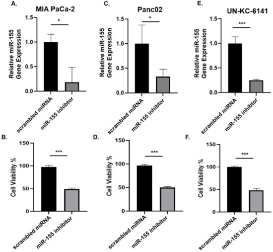 miR-155 is implicated in the development of pancreatic tumors from pancreatic intraepithelial neoplasia (PanIN) lesions, and is overexpressed in PC [23]. We then asked whether the depletion of miR-155 modulated PC viability. Murine and human PC cell lines were transfected with miR-155 inhibitor (i.e., MMU-MIR-155-5P/HSA-MIR-155-5P) and scrambled miRNA at a concentration of 100 nM for 24 h and cell viability determined using an MTT assay. As well, the expression of miR-155 was examined using an RT-qPCR assay. Our results show that miRNA-155 inhibitor significantly depleted miR-155 gene expression, and correspondingly, suppressed the viability of three different PC cell lines compared to scrambled miRNA (Figure 2A–F), indicating the vital role that miR-155 plays in the growth of PC.