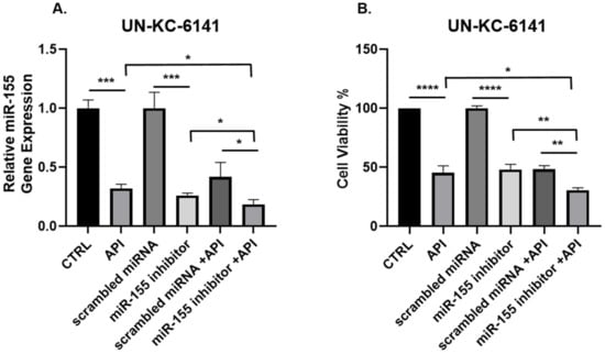 miR-155 gene expression and cell viability are synergistically suppressed in murine UN-KC-6141 cells after combined treatment with API and miR-155 inhibitor. UN-KC-6141 cells were treated with miR-155 inhibitor (100 nM), API (40 µM), their respective controls or in combination and assessed for (A) miR-155 gene expression or (B) cell viability. Data are presented as the mean ± S.D. of each experimental group (n = 3). * p < 0.05; ** p < 0.001; *** p < 0.001; **** p < 0.0001 (by two-tailed t test).