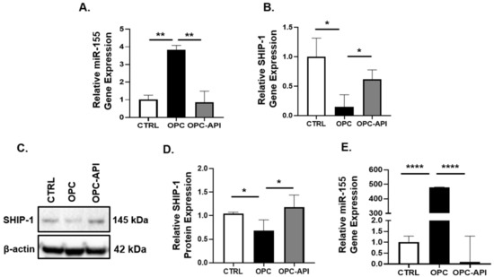 3.4. API Decreases the Production of miR-155 and This Correlates with an Increase in SHIP-1 Expression in HPC, OPC and KC-HPC Mouse Models