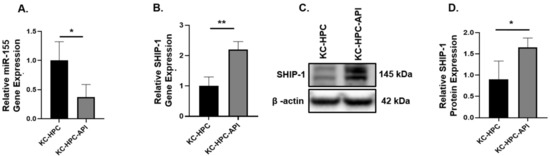 API treatment decreased miR-155 expression in KC-HPC mice, which correlated with an increase in SHIP-1 expression. Relative (A) miR-155 and (B) SHIP-1 gene expression in the tumors from KC-HPC and KC-HPC-API mice. (C,D) WB analysis and representative quantification of SHIP-1 protein from the tumors of KC-HPC and KC-HPC-API mice. Data are presented as the mean ± S.D. of KC-HPC (n = 3–4), KC-HPC-API (n = 3–4). * p < 0.05; ** p < 0.01 (by two-tailed t test).