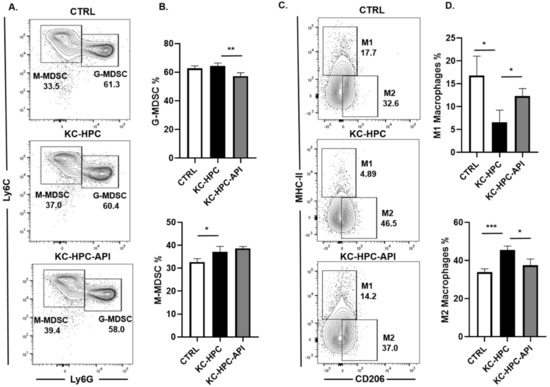 API treatment of KC-HPC mice modulated MDSC and macrophage subsets in the BM. Flow cytometric analysis and representative quantification of (A,B) MDSC subsets, G-MDSC (CD11b+Ly6C+/−Ly6G+) and M-MDSC (CD11b+Ly6G−Ly6C+), and (C,D) macrophage subsets, M1 (CD11b+Ly6C+/−Ly6G−F4/80+CD206−MHCII+) and M2 (CD11b+Ly6C+/−Ly6G−F4/80+CD206+MHCII−), from the BM of CTRL, KC-HPC and KC-HPC-API treated mice. Data are presented as the mean ± S.D. of CTRL (n = 3–4), KC-HPC (n = 4) and KC-HPC-API (n = 3–4) mice. * p < 0.05; ** p < 0.01; *** p < 0.001 (by two-tailed t test).