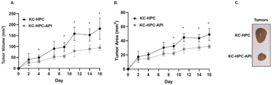 API treatment of KC-HPC mice decreased tumor burden. Tumor growth curves representing (A) tumor volume and (B) tumor area in KC-HPC mice treated with API. (C) Representative images of KC-HPC and KC-HPC-API tumors at the humane endpoint of the study. Data are presented as the mean ± S.D. of KC-HPC (n = 3–4) and KC-HPC-API (n = 3–4) mice. * p < 0.05 (by two-tailed t test).