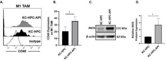 API treatment of KC-HPC mice increased CD40 expression on M1 TAM and iNOS in the tumor. (A,B). Flow cytometric analysis of CD40 expression on M1 TAM (CD11b+Ly6C+/−Ly6G−F4/80+CD206−MHCII+) in the tumors of KC-HPC and KC-HPC-API mice. (C,D) WB analysis and representative quantification of iNOS protein in the tumors from KC-HPC and KC-HPC-API mice. Data are presented as the mean ± S.D. of KC-HPC (n = 4), KC-HPC-API (n = 4) mice. * p < 0.05 (by two-tailed t test).