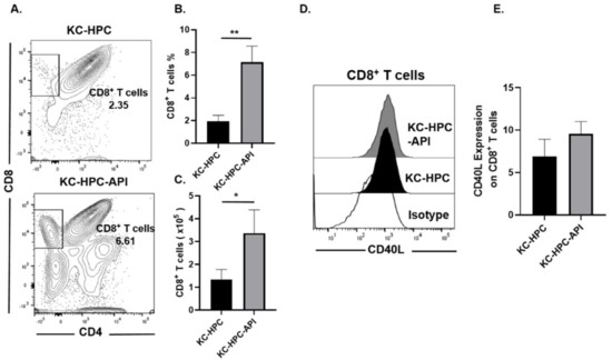 API treatment of KC-HPC mice increased CD8+ T cell infiltration into the tumor. (A,B) Flow cytometric analysis and (C) absolute cell number of CD8+ T cells (CD3+CD8+CD4−) and its expression of (D,E) CD40L in the tumors of vehicle-treated KC-HPC mice and API treated KC-HPC mice. Data are presented as the mean ± S.D. of KC-HPC (n = 4), KC-HPC-API (n = 4) mice. * p < 0.05; ** p < 0.01 (by two-tailed t test).