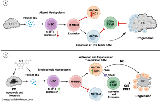 Proposed Model: (A) In the PC tumor microenvironment, tumor derived factors such as PC-induced miRNA-155 impacts hematopoietic stem cells (HSC) and alters myelopoiesis by targeting and downregulating SHIP-1 gene and protein expressions. The reduction in SHIP-1 expression corresponds with the expansion of M-MDSC that correspond with the development of pro-tumor M2-TAM which, in turn, impair anti-tumor immunity and result in PC progression and metastasis. (B) The therapeutic use of the bioflavonoid API induces apoptosis and necrosis of PC cells and causes a decrease in miRNA-155 in the pancreatic tumor. This reduction correlates with an increase in SHIP-1 gene and protein expressions that results in the expansion of M-MDSC which coincides with the development of tumoricidal M1-TAM. These tumoricidal M1-TAM have increased CD40 expression which interacts with CD40L on CD8+ T cells, resulting in M1-TAM activation, production of iNOS/NO and an overall increase in anti-tumor immunity. This is signified by the release of granzyme B (GrB) and perforin (PRF) as well as the robust activation of effector CD8+ T cells, leading to PC regression. Created with BioRender.com (accessed on 21 March 2022).