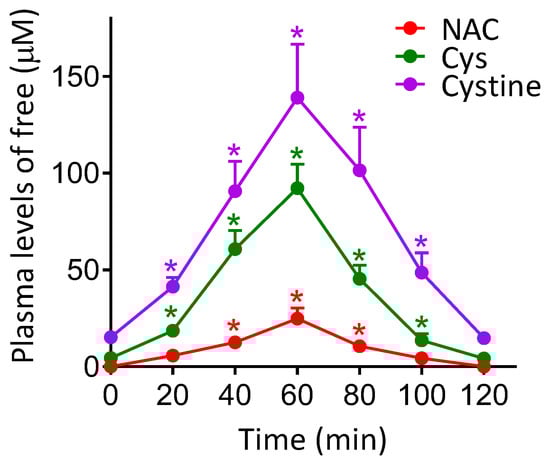 - Tsikas, D.; Sandmann, J.; Ikic, M.; Fauler, J.; Stichtenoth, D.O.; Frölich, J.C. Analysis of Cysteine and N-Acetylcysteine in Human Plasma by High-Performance Liquid Chromatography at the Basal State and after Oral Administration of N-Acetylcysteine. J. Chromatogr. B Biomed. Sci. Appl. 1998, 708, 55–60. [Google Scholar] [CrossRef]