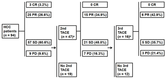 Flow chart summarizing the TACE sessions and tumor responses in the series of HCC patients. a Four patients without preserved imaging follow-up data after the second TACE; b two patients without preserved imaging follow-up data after the third TACE.