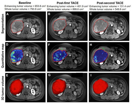 Three-dimensional volumetric semiautomatic evaluation of tumor response after two sessions of TACE therapy in one case. The first row shows the 3D tumor segmentation before treatment, after the first TACE, and after the second TACE treatment, respectively (A–C). At baseline, the enhancing-tumor volume was 653.8 cm3 (D) and the whole-tumor volume was 793.9 cm3 (E). After the first TACE, the patient showed non-response to treatment, with enhancing-tumor volume of 401.9 cm3 (F), and whole-tumor volume of 899.6 cm3 (G). However, after the second TACE treatment, the patient responded to TACE. The enhancing-tumor volume decreased significantly to 131.4 cm3 (H), although the whole-tumor volume remained stable, with a value of 549.8 cm3 (I). The green box represents the location of the background region of interest.