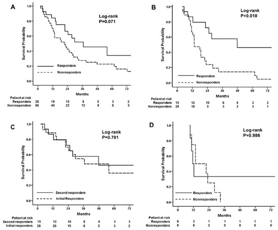 At the time the study was conducted, 60 patients (63.8%) had died. The median OS was 24.1 months (95%CI 19.8–28.4). After the first TACE, the OS was similar between the initial-response and non-response groups, although there was a clear positive trend between response and survival (36.7 months (95%CI 9.8–63.6) vs. 21.5 months (95%CI 15.9–27.1), respectively; p = 0.071) (Figure 3A). The OS was similar between the initial non-responders who received a second TACE and those who did not (22.5 months (95%CI 15.5–29.5) vs. 21.5 months (95%CI 0.00–48.4), respectively; p = 0.831). After the second TACE, the median OS of the responders was significantly longer than that of the non-responders (47.8 months (95%CI 23.8–96.5) vs. 13.6 months (95%CI 8.0–19.2), respectively; p = 0.010) (Figure 3B). Furthermore, there was no significant difference in OS between the 28 responders after the first TACE and the 15 responders after the second TACE (36.7 months (95%CI 10.4–63.0) vs. 47.8 months (95%CI 23.8–96.5), respectively; p = 0.701) (Figure 3C). The liver function was similar between the initial responders and second responders. There were six patients with Child–Pugh B7 liver function among the 28 initial responders and one patient with Child–Pugh B7 liver function in 15 responders (p = 0.391). The OS was similar between the patients who received a third TACE and those who did not (18.0 months (95%CI 11.4–24.6) vs. 13.6 months (95%CI 12.8–14.3), respectively; p = 0.616). The difference in OS between the responders and non-responders after the third TACE was not significant (11.4 months (95%CI 9.2–13.6) vs. 13.5 months (95%CI 3.2–23.8), respectively; p = 0.986) (Figure 3D).