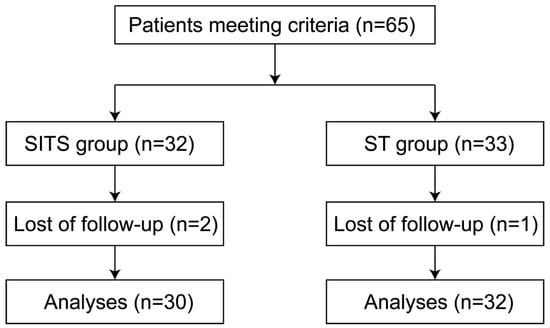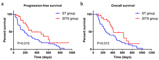 Treatment effects are summarized in Table 2. PR, SD, and disease progression were observed in ten (33.3%), seven (23.3%), and seven (23.3%) patients of the SITS group, respectively, vs. eight (25.0%), nine (28.1%), and fifteen (46.9%) in the ST group, respectively. Complete response was achieved in six patients in the SITS group vs. none in the ST group. The ORR was significantly higher in the SITS group than in the ST group (53.3% vs. 25.0%, p = 0.036), but no differences were found in DCR (p = 0.067). Importantly, twelve (40.0%) patients experienced successful downstaging after SITS administration, vs. none among ST-treated cases. Survival analysis also showed longer median PFS (10.4 vs. 6.3 months, p = 0.015) and OS (13.8 vs. 8.8 months, p = 0.013) in SITS-treated cases compared with patients administered ST (Figure 2).