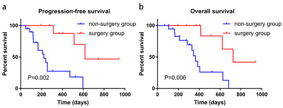 Kaplan–Meier curve analysis of PFS (a) and OS (b) in the surgery and non-surgery subgroups. PFS, progression-free survival; OS, overall survival.