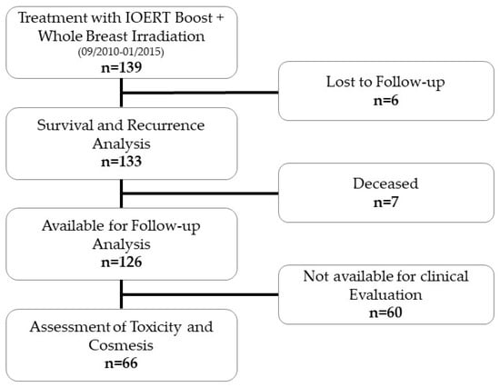 Patients with histologically confirmed breast cancer receiving IOERT during breast-conserving surgery as a boost followed by WBRT were included in this investigation; 139 consecutive patients treated between January 2010 and January 2015 at our Breast Cancer Center Duesseldorf were included (Figure 1). Patients were selected according to S3-guidelines for breast cancer: indication for BCS, premenopausal patients or postmenopausal patients with tumor size ≥ 2 cm, G3, Her2 positive, triple negative, extensive intraductal component (EIC). Some patients received the boost as an individual decision, especially in patients with a tumor size of nearly 2 cm. The study was approved by the Ethical Board of the Heinrich Heine University Duesseldorf (Ref. nr. 4671).