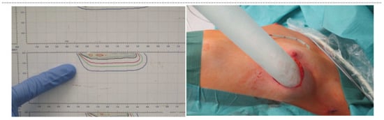 For all patients, the overall treatment strategy was applied according to the national guidelines or international study protocols and determined in the context of an interdisciplinary tumor board. IOERT was recommended as part of a multidisciplinary treatment approach consisting of surgery, radiotherapy and systemic treatment. Depending on the individual risk profile, surgery was performed either up-front or after neoadjuvant therapy. In the case of neoadjuvant therapy, sentinel lymph node biopsy was performed prior to the initiation of systemic treatment. The standard surgical approach consisted of segmental resection with sentinel lymph node biopsy or axillary dissection. The size of the tumor bed and the distance of the tumor bed to rib and fascia were measured through intraoperative ultrasound. IOERT was performed using a dedicated mobile robotic linear accelerator (NOVAC 7, New Radiant Technology, Aprilia, Italy). Depending on the individual intraoperative anatomic situation, the tumor diameter, the thoracic wall thickness and the distance to the OAR rib were measured by intraoperative ultrasonography (Figure 2). The physician-physicist team selected the “dose plan of the day” including the tube diameter (40 or 50 mm), the tube angle (0°, 22.5° or 45°) and the electron beam energy (5, 7 or 9 MeV). A total dose of 10 Gy was administered to the 90% isodose using 5, 7 or 9 MeV electrons depending on the thickness of breast parenchyma and the distance to the rib. At the rib surface, a maximum dose of 7 Gy was allowed to avoid necrosis. We used this regimen according to the experience of other research groups []. Shielding disks were not necessary with this approach. In order to limit the dose applied to the ribs, compromises were allowed. All patients received adjuvant WBRT. Thereby, the entire breast was considered the clinical target volume (CTV). The planning target volume (PTV) was defined as the CTV with a margin of 7–10 mm. Figure 3 illustrates the plan and procedure. Depending on the individual risk profile, systemic treatment with chemotherapy, targeted and or endocrine therapy was given according to national guidelines.