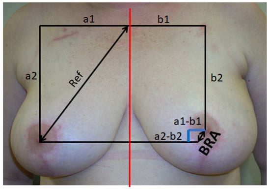 As described by Vrieland et al. [] and in our previous work [] the breast retraction score (BRA) was calculated to evaluate breast asymmetry (Figure 4). Thereby, a score of 0 constitutes the best outcome, while an increasing degree of impairment is found at higher values of the score.