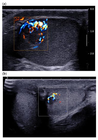 - Maxwell, F.; Izard, V.; Ferlicot, S.; Rachas, A.; Correas, J.-M.; Benoit, G.; Bellin, M.-F.; Rocher, L. Colour Doppler and ultrasound characteristics of testicular Leydig cell tumours. Br. J. Radiol. 2016, 89, 20160089. [Google Scholar] [CrossRef] [PubMed]