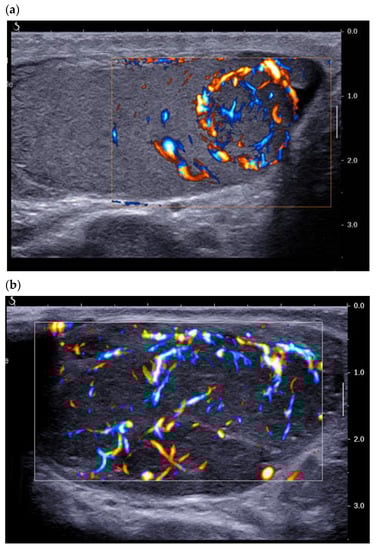These differences can be explained by improvements in the sensitivity of ultrasound probes and in the performance of the Doppler mode. The use of ultrasensitive Doppler further improves the detection of intra- and peri-lesional flows and ameliorates identification of the enveloping pattern, which is suggestive of LCTs (Figure 2) [16].