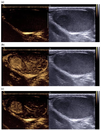 - Luzurier, A.; Maxwell, F.; Correas, J.M.; Benoit, G.; Izard, V.; Ferlicot, S.; Teglas, J.; Bellin, M.; Rocher, L. Qualitative and quantitative contrast-enhanced ultrasonography for the characterisation of non-palpable testicular tumours. Clin. Radiol. 2018, 73, 322.e1–322.e9. [Google Scholar] [CrossRef]