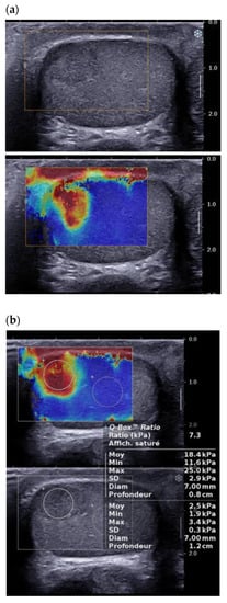 - Roy, C.; de Marini, P.; Labani, A.; Leyendecker, P.; Ohana, M. Shear-wave elastography of the testicle: Potential role of the stiffness value in various common testicular diseases. Clin. Radiol. 2020, 75, 560.e9–560.e17. [Google Scholar] [CrossRef]