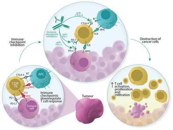 Immune checkpoint inhibitors induce tumour cell death by activating pre-existing CD8+ TILs. CD8+ TILs express T cell receptors (TCRs) that recognise antigens presented by major histocompatibility complexes (MHCs) on either tumour cells or antigen-presenting cells (APCs). TCR–antigen–MHC interactions prime and activate CD8+ TILs to induce apoptosis. This interaction, however, is downregulated by the activation of immune checkpoints, for example, the binding of cell surface receptor proteins PD-L1 (programmed death-ligand 1) with PD-1 (programmed death-1), and CTLA-4 (cytotoxic T lymphocyte-associated antigen-4) with B7 proteins. The blockade of these axes, via ICIs, allows CD8+ TILs to circumvent these inhibitory signals.