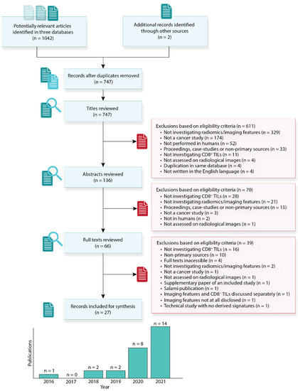 The study selection process is presented in Figure 3. Our search yielded 1044 articles, of which 2 were manually retrieved from other sources; 297 articles were initially removed on the basis of duplication, and 611 were excluded upon evaluation at the title level, 70 at the abstract level, and 39 at the full-text level, culminating into a final 27 publications for analysis in this review. The results from our literature search and individual screens are available in Supplementary Tables S3 and S4. The majority of the selected studies were published in the last two years, confirming our initial hypothesis that radiomics involving CD8+ TILs is a new research avenue.