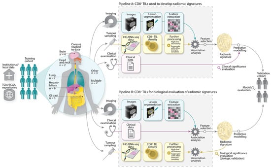 Radiomics workflow typically seen in the included studies. Imaging, biological, and clinical data were sourced from institutions and/or public repositories, before being subjected to further processing. To develop radiomic signatures, Pipeline A describes the main approach taken in the reviewed studies. Here, radiomic features were directly analysed for their association with CD8+ TILs. Features associated with CD8+ TILs were retained for radiomic signature derivation, model construction, and further evaluation. Pipeline B describes an alternate pathway where radiomic signatures were first developed by assessing the association of features with clinical variables, e.g., objective response. Signatures were then evaluated for their association with CD8+ TILs to explain, at least partially, the biological basis of the radiomic signatures. Acronyms: TCIA/TCGA = The Cancer Imaging Archive/The Cancer Genome Atlas, IHC = immunohistochemistry, RNA-seq = RNA sequencing.