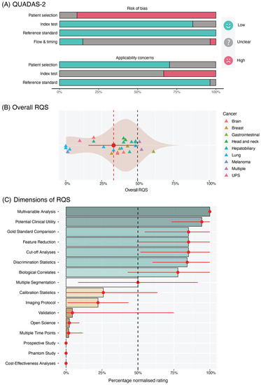 To address review objective (iii), articles were assessed using the Quality Assessment of Diagnostic Accuracy Studies version 2 (QUADAS-2) [30] and Radiomics Quality Score (RQS) [25] tools. In accordance with QUADAS-2 scoring design, we evaluated potential risks of bias and/or the applicability of the included studies in four domains: patient selection, index test, reference standard, and flow and timing. On the other hand, the RQS assigns an overall score that is reflective of the methodological quality of a radiomics study. This score, which can range from −8 to 36, is derived from the summation of ratings for 16 dimensions. Each dimension represents a key component in the radiomics pipeline (e.g., imaging protocol quality). Both tools have their own strengths: the QUADAS-2 tool is more well-established in systematic reviews, while the RQS is more specific to radiomics. We used both tools to ensure a spectrum.