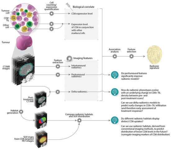 The emerging field of radiomics centres on the premise that quantitative features observed in medical images may have biological underpinnings. Tumour regions with distinct radiomic phenotypes have been postulated to be representative of different tumour microenvironments [18,19] and various TIL gene expression patterns [20]. Tumours manifesting shape and texture irregularities have also been reported to show better ICI response [21]. The identification of a constellation of imaging features (“radiomic signature”) linked to CD8+ TILs is desirable: it could create a novel way of evaluating treatment outcomes in a manner that is non-invasive and complementary to routine patient management, as the collection of imaging data is undertaken as part of existing standards of care. Furthermore, radiomics-based biomarkers can be computed repeatedly, and permit the 3D evaluation of the entire investigated tumour lesion. While promising, it is also worth highlighting that radiomics research is characterised by substantial methodological heterogeneity [22]. Many have called for the adoption of rigorous, transparent, and standardised workflows to ensure the reproducibility of radiomic signatures [23,24,25,26,27].