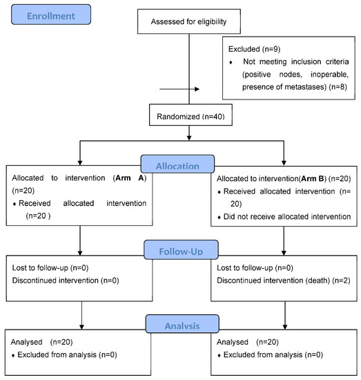 In this trial, 40 patients were randomized and are presented in a CONSORT diagram (Figure 1). Baseline characteristics were well balanced in terms of age, tumor location, T stage and tumor size (Table 1).