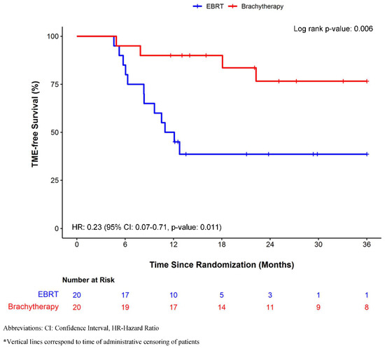 We used descriptive statistics to summarize the baseline characteristics of the study population by trial arm including mean, standard deviation, median, and interquartile range for continuous variables and counts and frequencies for categorical variables. The Kaplan–Meier method and log-rank test were used to compare TME-free survival between treatment arms. The cumulative hazard was estimated using the Nelson–Aalen estimator. We used a negative binomial regression model to calculate incidence rates (per 100 person-years) and corresponding 95% confidence intervals for the primary outcome. Cox proportional hazards models were used to estimate hazard ratios and 95% confidence intervals comparing the rate of composite outcome (TME or death) for patients who were randomized to treatment with IGAEBT in comparison with patients randomized to treatment with EBRT using intention to treat analysis. We conducted sensitivity analyses adjusting for a priori-defined prognostic factors assessed at baseline [29,30]. All reported p-values are two-sided. Analyses were conducted using the SAS software version 9.4 (SAS Institute Inc., Cary, NC, USA) and R statistical software (Vienna, Austria).