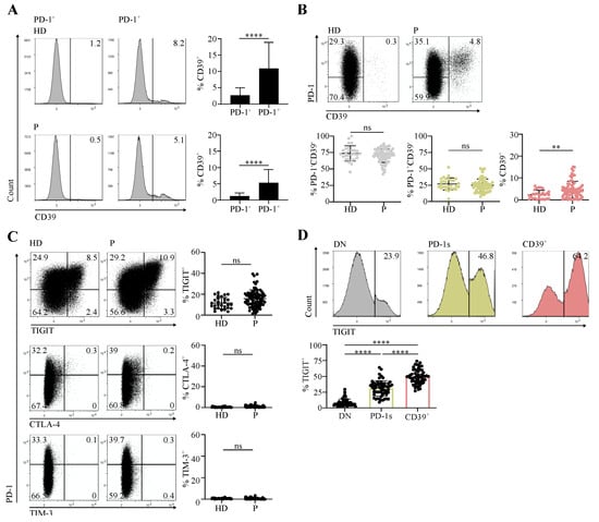 We and others have shown that CD4 and CD8 TILs, positive for PD-1, express other immune checkpoints (ICs), including TIGIT, CTLA-4, and TIM-3, and are functionally exhausted [4,5,8,13]. We thus assessed the expression of these ICs in circulating memory Tconv from HDs and cancer patients. We did not detect a significant expression of CTLA-4 and TIM-3 (Figure 1C). In contrast, TIGIT was expressed and the proportions of TIGIT+ cells were not different between patients and HDs (Figure 1C). In patients, the proportions of TIGIT+ cells were higher in the CD39+ subpopulation than among DN and PD-1s cells (Figure 1D).