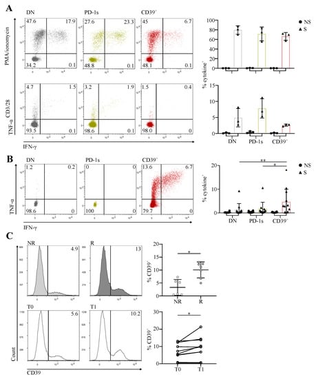 When stimulated with PMA/ionomycin, which bypass TCR, CD39+ cells produced amounts of IFN-γ and/or TNF-α comparable to those produced by DN and PD-1s memory Tconv (Figure 3A). When stimulated with anti-CD3/CD28, instead, CD39+ cells showed lower cytokine production in comparison with the two other populations (Figure 3A), suggesting that they were exhausted [23].