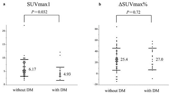 Comparison of SUVmax1 (a) and ΔSUVmax% (b) between patients with and without diabetes mellitus. (a) Patients with tumors showing without diabetes mellitus was significantly higher SUVmax1 than patients with tumor showing with diabetes mellitus (P = 0.032). (b) Patients with tumors showing without diabetes mellitus was not higher ΔSUVmax% than patients with diabetes mellitus (P = 0.72).