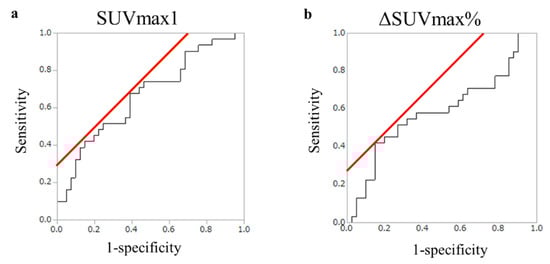 Selection of the cut-off point for and ΔSUVmax%. (a) Receiver operator characteristic (ROC) curves of the maximum standardized uptake value at 60 min (SUVmax1) with reference to relapse events within one year of pancreatectomy (n = 72). SUVmax1 at the cut-off value was 7.18, and the area under the curve (AUC) was 0.59 (95% confidence interval (CI) 0.44–0.72). (b) ROC curves of ΔSUVmax% with reference to relapse events within one year of pancreatectomy (n = 72). ΔSUVmax% at cut-off value was 24.25; AUC was 0.67 (95% CI 0.53–0.78).