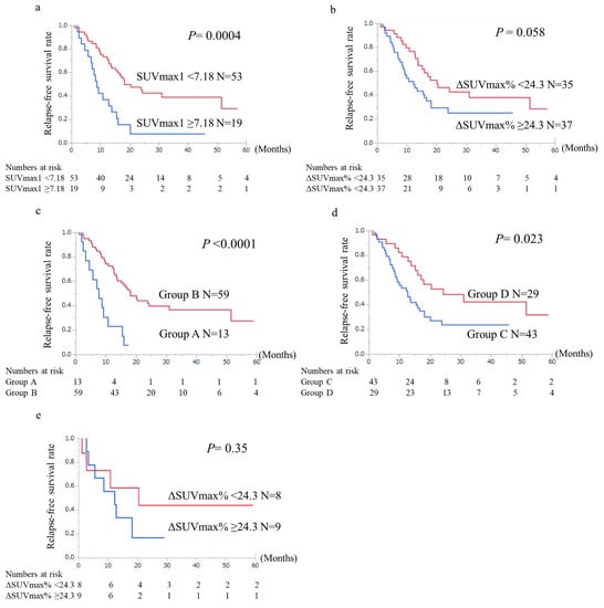Comparison of relapse-free survival (RFS) curves between the patient groups of (a) high and low SUVmax1 values, (b) high and low ΔSUVmax%, (c) Group A, high SUVmax1 and high ΔSUVmax%, and Group B, and others, and (d) with Group C, high SUVmax1 and/or high ΔSUVmax%, and Group D, and others. (e) High and low ΔSUVmax% in diabetes mellitus patients. The group of high SUVmax1, Group A and Group C represented statistically unfavorable outcomes compared with the group of low SUVmax1 (a: P = 0.0004), Group B (c: P < 0.0001) and Group D (d: P = 0.023). On the other hand, ΔSUVmax% (b) and ΔSUVmax% in diabetes mellitus patients (e) were not correlated with RFS of the patients.