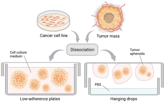 Formation of cancer cell spheroids and tumorspheres. Spheroids are formed from the dissociation of cancer cell monolayers/tumor masses upon cell growth in suspension. This can be achieved by culture in low-adherence plates (left) or by applying the hanging drop method (right). Created with BioRender.com.