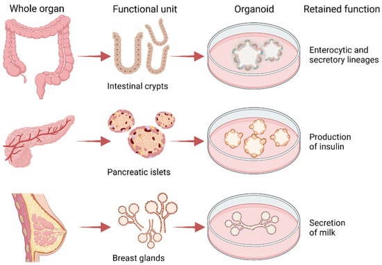 The advent of the organoid technology, which dates back to 2009 [42], has made it possible to propagate a variety of stem cells (adult, fetal, embryonic, induced pluripotent) from which heterogeneous cell populations are derived to recreate tissue architecture and functions in a dish [43]. Specific culture conditions are of fundamental importance for the maintenance of in vivo traits: this is the case of intestinal organoids that in niche-inspired medium preserve both the enterocytic and secretory lineages as they are in the crypts [44], but also of pancreatic and breast organoids that in specific media produce insulin and milk, respectively [45,46] (Figure 2). Media setup is crucial to allow cell proliferation and the onset of lineage-specific gradients that promote differentiation. In other cases, a specific medium—frequently including inhibitors—has to be prepared for differentiation to occur [47]. We suggest the review from Kim et al. for an accurate glimpse of what the media for different type of organoids are made of [48].