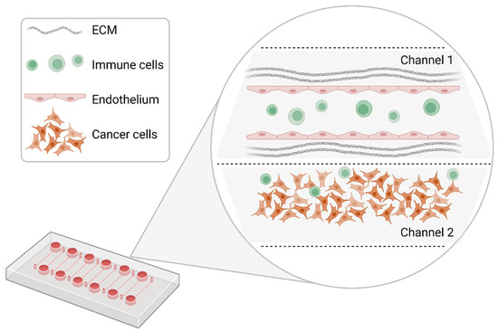 Schematic representation of a model organ-on-a-chip configuration. Within different channels, segregated micropillars of endothelial cells can be cultivated to form a functional vessel. Cancer cells are added and cultivated in the second channel. Immune cells are infused to evaluate their interaction with cancer cells and endothelial cells. Created with BioRender.com.