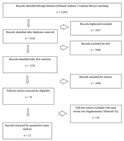 The search of the literature yielded 11,041 citations. After removal of duplicates, a total of 9125 citations remained, and 7899 of those were excluded using the title and abstract (respectively, 7996 and 1048), leading to 82 studies being assessed for relevance using a full-text review (the main reasons for exclusion are described in Supplementary Materials Table S2). Of these, 12 studies met the inclusion criteria. Decisions on which studies to include were made blindly by three reviewers (E.D.A, A.D.R, and F.F.). Disagreements were resolved by discussion. Studies were excluded if they were: review articles, guidelines, commentaries, editorials, letters not in English, ex vivo or in vivo studies, or studies describing patients with major and minor risk factors without discriminating between different results for the population.