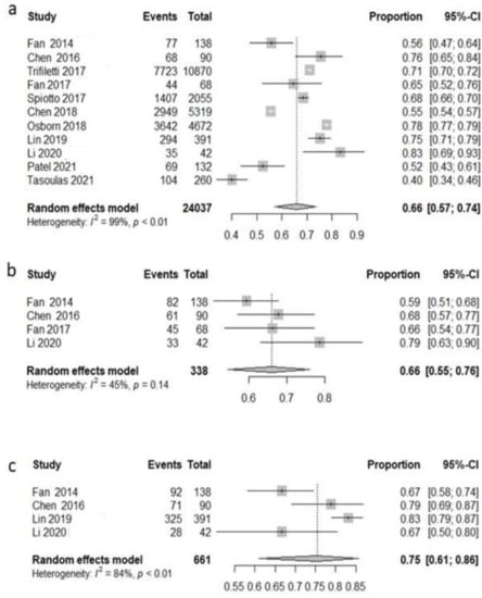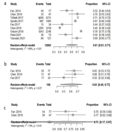 Among all patients, 12,883 were treated with radiotherapy across nine studies [76,77,78,79,81,82,84,85,87], and the pooled 3 y OS rate was 61.2% (95%CI: 50.7–70.7%) with high heterogeneity (I2 = 99.2%, p < 0.0001) (Figure 3a). Three studies [78,79,82] reported disease-free survival. The pooled 3-year disease-free survival was 62% (95%CI: 44.6–76.8%) with low heterogeneity (I2 = 23.9%, p = 0.268) (Figure 3b). Only two studies [78,82] reported 3-year local recurrence-free survival; the pooled LRFS was 72.6% (95%CI: 17–97.2%) with low heterogeneity (I2 = 0, p = 0.4346) (Figure 3c).