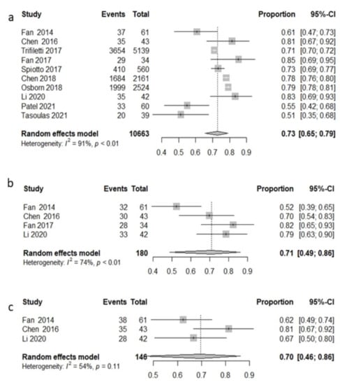 Among all patients, 10,663 were treated with radiochemotherapy across 10 studies [76,77,78,79,81,82,83,84,85,87], and the pooled 3 y OS rate was 72.9% (95%CI: 65.5–79.2%) with high heterogeneity (I2 = 91.5%, p < 0.0001) (Figure 4a). Four studies [75,78,79,82] reported disease-free survival. The pooled 3-year disease-free survival was 70.9% (95%CI: 48.8–86.2%) with high heterogeneity (I2 = 74.4%, p = 0.008) (Figure 4b). Only three studies [75,78,82] reported 3-year local recurrence-free survival, and the pooled LRFS was 69.8 (95%CI: 46.1–86.1%) with moderate heterogeneity (I2 = 53.8%, p = 0.115) (Figure 4c).