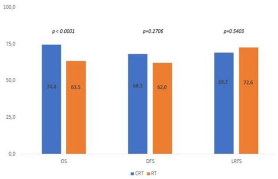 In fact, the LRFS of the POCRT group seems to be worse compared to the group treated with PORT alone: this trend could be explained by the fact that patients treated with POCRT could have multiple minor RFs that worsen their prognosis despite the addition of concomitant CT.