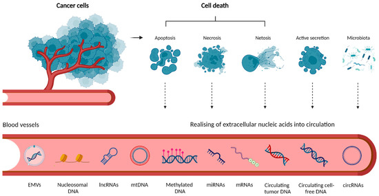 Origin of extracellular nucleic acids in circulation. Tumor cells release extracellular cfNAs through a combination of (i) cell death such as apoptosis, necrosis, and netosis or (ii) active secretion. Circulating bacterial DNA (cbDNA) may also be detected in blood samples from cancer patients. The loss of membrane integrity in necrosis results in releasing intracellular contents, including fragments of DNA, into the circulation. In netosis, activated neutrophils release neutrophil extracellular traps, webs of chromatin, and mitochondrial DNA (mtDNA). cfDNA may exist in the peripheral blood as either free or linked to proteins in the form of nucleosomal DNA, or associated with extracellular membrane vesicles (EMVs) such as exosomes or microvesicles secreted by cells. Methylated DNA and various types of RNA are present as well (created with Biorender.com, accessed on 21 July 2022).