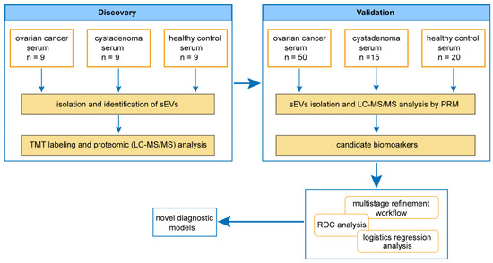 The overall design and flow chart to obtain protein profiles of serum sEVs for ovarian cancer and establish novel diagnostic models. In the discovery study, nine patients with ovarian cancer or cystadenoma and nine healthy controls were enrolled. Isolated sEVs were subjected to TMT labeling LC-MS/MS analysis. PRM was used to further assess candidate biomarkers in a validation cohort composed of 50 patients with ovarian cancer, 15 patients with cystadenoma, and 20 healthy controls. Through ROC analyses, logistic regression analyses and a multistage refinement, novel diagnostic models were constructed for the purpose of ovarian cancer screening in a population or differential diagnosis between ovarian cancer and cystadenoma.