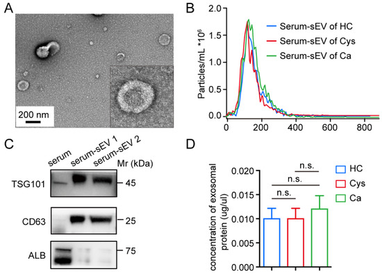 Identification of sEVs. (A) The typical morphology of sEVs using TEM; the picture in the lower right corner is the enlarged picture. Scale bar, 200 nm. (B) NTA analysis of sEVs from different groups; the horizontal axis represents the diameter of the particle, and the vertical axis represents the number of qualified particles. (C) Protein expression of canonical biomarkers of sEVs using western blotting. (D) Comparison of the protein concentrations after extraction from different groups of sEVs. n.s., no significance.