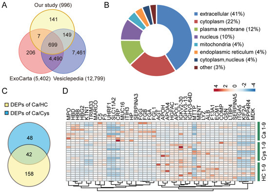 Proteomic profiles of sEVs. (A) Venn diagram showed the intersection between the proteins we identified and the proteins from the known databases ExoCarta and Vesiclepedia. (B) The circle chart displayed the cellular location of the identified proteins. (C) Venn diagram showed the intersection of the DEPs between the Ca group and the HC group and the DEPs between the Ca group and the Cys group. (D) Heat map of protein expression distribution of the above 42 DEPs from (C).