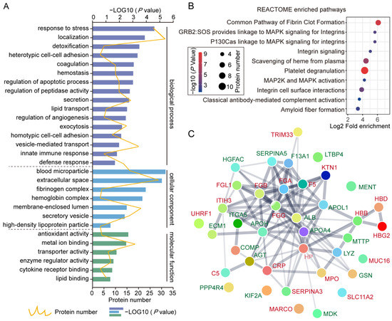 To provide insights into the biological functions mediated by proteins within sEVs in the pathogenesis of ovarian cancer, 42 DEPs identified above were subjected to GO analysis. The enriched biological processes included the response to stress (detoxification and hemostasis), localization, cell adhesion, coagulation, secretion (exocytosis and vesicle-mediated transport), defense response (innate immune response), and lipid transport. The blood microparticle, extracellular space, fibrinogen complex, and secretory vesicle constituted the main cellular components of DEPs. In addition, molecular function annotations included antioxidant activity, metal ion binding, transporter activity, enzyme regulator activity, and cytokine receptor binding were closely involved among the DEPs (Figure 4A). Based on the REACTOME pathway analyses, the DEPs were enriched in 10 significant signaling pathways, including common pathways of fibrin clot formation, MAPK signaling, integrin signaling, platelet degranulation, and complement activation (Figure 4B). A PPI network was constructed using the STRING database to explore the potential interactions among the 42 DEPs (Figure 4C). Overall, through functional enrichment analyses, we found that the DEPs were involved in the secretion and transportation of the vesicle, the cellular signal transduction, coagulation, and complement activation, implying that circulating sEV proteins derived from patients with ovarian cancer probably actively participate in the regulation of cellular homeostasis, immune response, and tumor growth.
